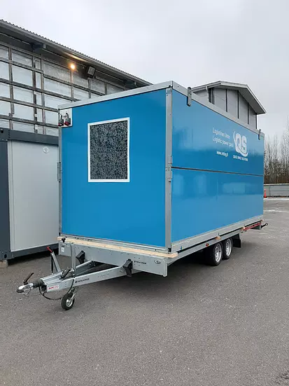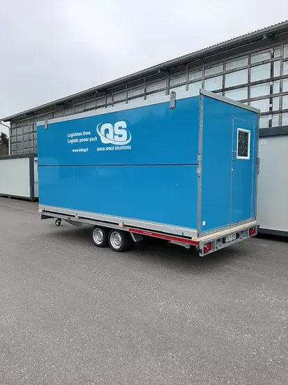 Peräkärryn päällä oleva QuickSpace moduuli, joka toimii varasto-, toimisto- tai työmaatilana. Yhdistelmän kokonaispaino 1590 kg.